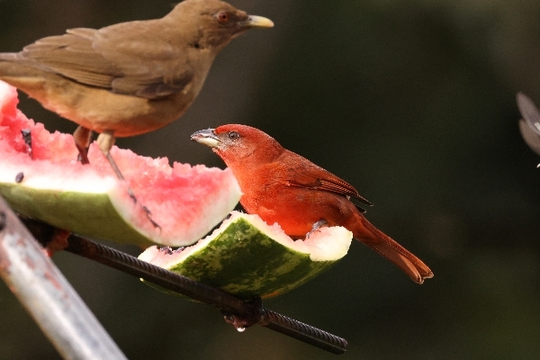 Hepatic Tanager with the Costa Rican national bird the Clay-colored Thrush - taken by Kevin Jones