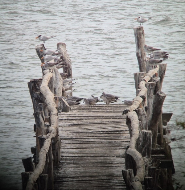 the old wooden jetty with Royal Terns and laughing Gulls roosting on it