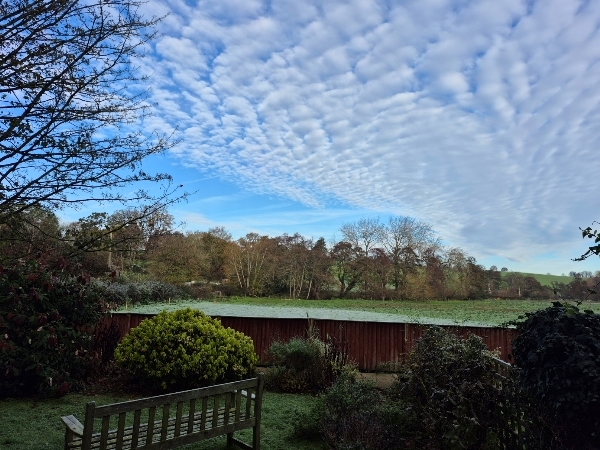 this was the view from my living room yesterday morning, a Mackerel Sky and a frozen meadow, beautiful