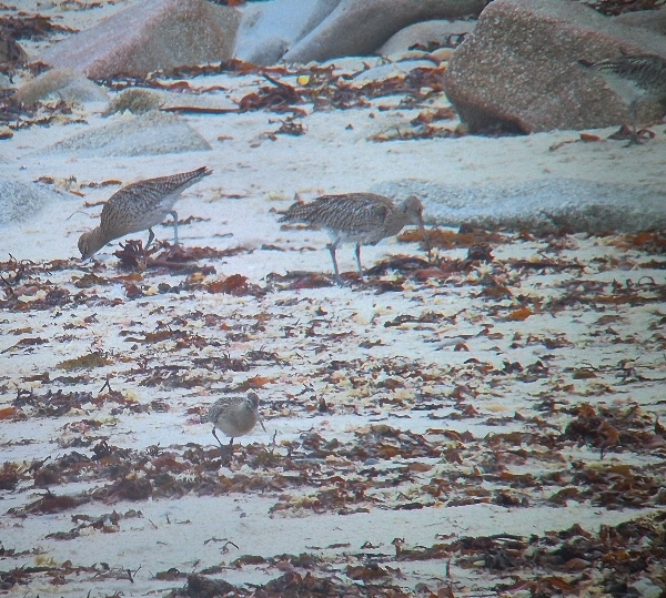 Bar-tailed Godwit in front of two Curlews on Porthloo Beach