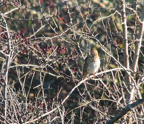 Blackbirds were in good numbers and one or two Redwings flew off at speed. I hid alongside a bush for about twenty minutes and hoped for the thrushes to return. I managed good views of the woodpeckers again, also a Song Thrush and more Redwings.