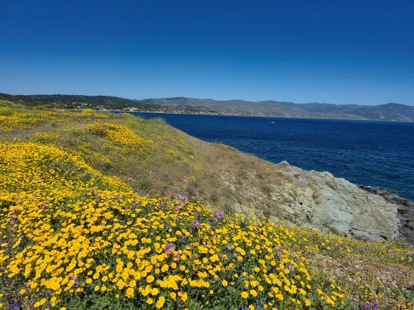 During our sea-watch we watched several groups of Yelkouan Shearwaters, we found a group of five Greenshanks on the rocks, we had excellent views of Olivaceous Warbler and we marvelled at the carpets of wild flowers covering the headland.