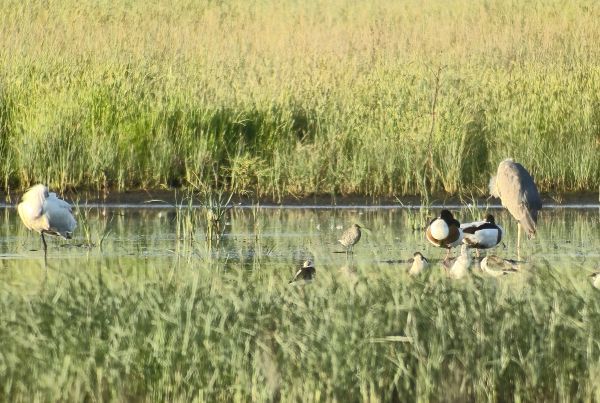 distant waders and others: Eurasian Spoonbill, Common Shelduck, Grey Heron, Black-winged Stilts and just left of the shelduck is a Spotted Redshank