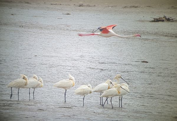 Eurasian Spoonbills being photo-bombed by a Greater Flamingo