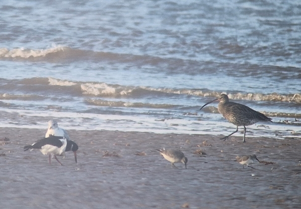 a mixed bag L to R - Common Gull, Oystercatcher, Red Knot, Curlew asnd a Dunlin