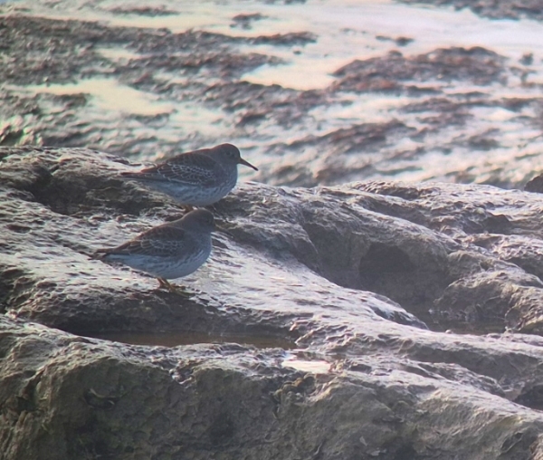 Rock Pipits seemed to be everywhere and a walk along to the Pulpit Rock produced nothing else, the tide was still quite high and the waves were lashing the rocks. We searched for Purple Sandpiper without success but I wasn't surprise because of the tide and the windy conditions. It wasn't until we were about to leave when five Purple Sandpipers flew in and landed on the sheletered ledge of the east cliff. Perfect, another star bird on the list.