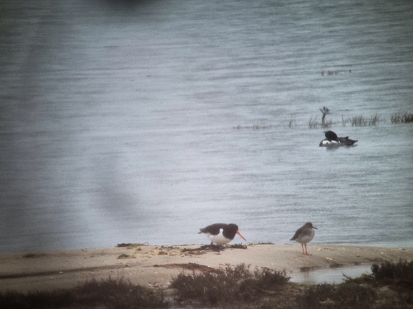 Oystercatcher with a Redshank and a Red-breasted Merganser behind them