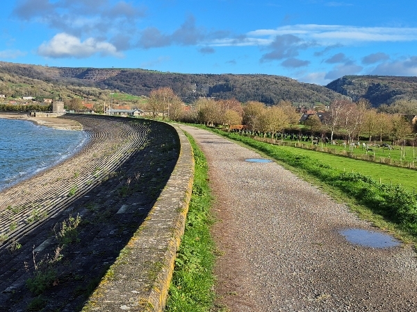 Ceddar Reservoir - a view of the Mendip Hill with Cheddar Gorge on the right, The Cheddar Yeo river cutting a swathe through the limestone rock.