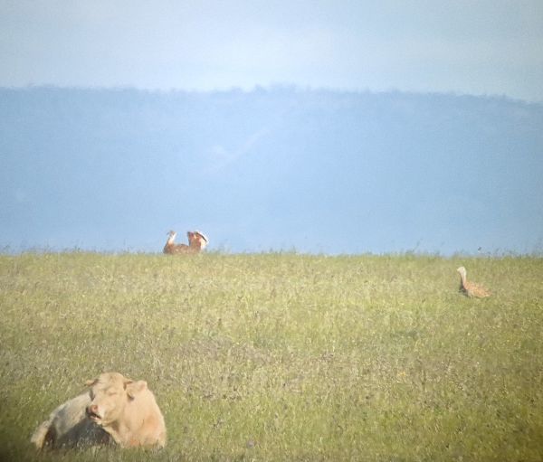 We then located a female Great Bustard on the ground with a male in display-mode strutting his stuff not far behind her. Whilst watching this pair a Little Bustard appeared in the grass, a male but he wasn't displaying just then.