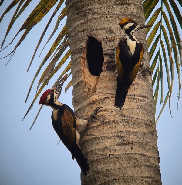 a pair of White-naped Woodpeckers at their nest hole (male has the red crown)