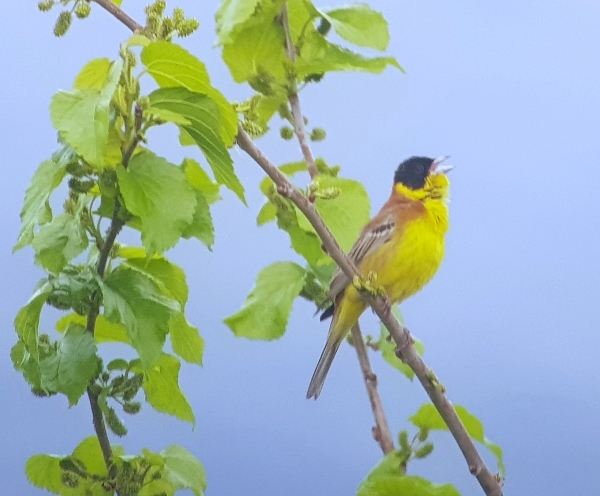 large numbers of the stunning Black-headed Bunting arrive in late April. The males arrive first and establish a breeding territory, you can hear them singing all day long.